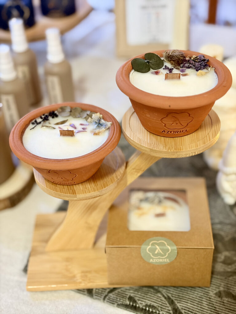Nasci no Brasil, filha de pais Terceirenses, e sei na primeira pessoa o que é sentir saudade e estar longe da família. Essa vivência despertou em mim a vontade de criar algo que fosse mais do que uma vela. Foi assim que, em 2024, nasceu a vela do alguidar, uma homenagem à Ilha Terceira, inspirada na alcatra, o nosso prato típico mais conhecido. Aromas como o “Azores Breeze” foram cuidadosamente escolhidos para transportar a brisa do mar e o frescor da floresta açoriana. O alguidar de barro é confecionado na Olaria local, em São Bento, e, depois de pronta, a vela é decorada com hortênsias colhidas e desidratadas artesanalmente.